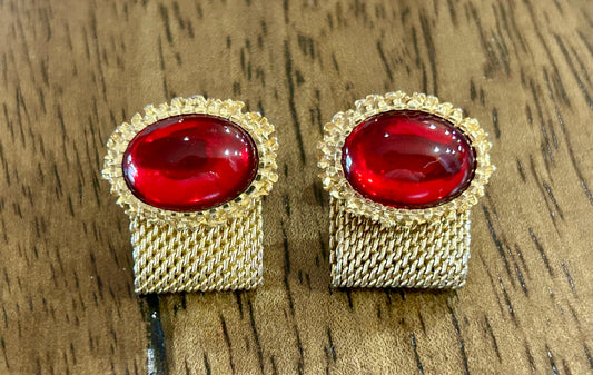 Vintage MCM Midcentury Anson Mesh Gold Tone Red Cabochon Cuff Links
