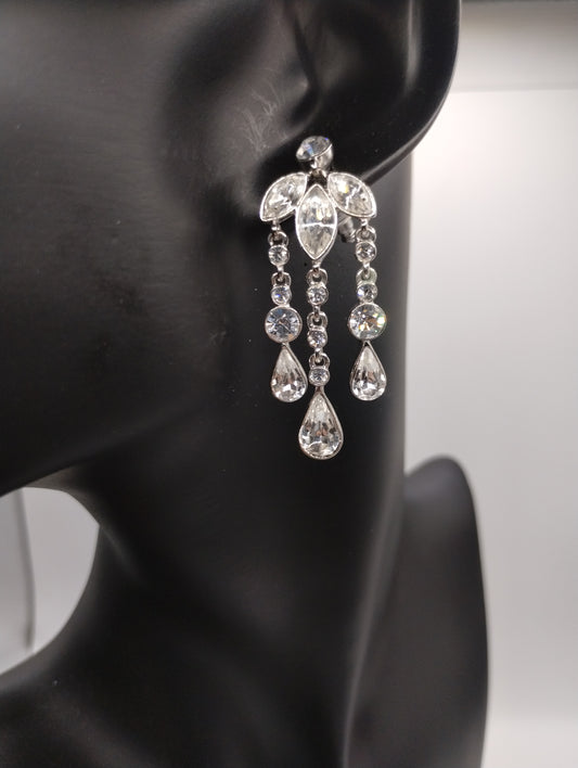 Silver Tone Textured Rhinestone Dangly Drop Pierced Earrings