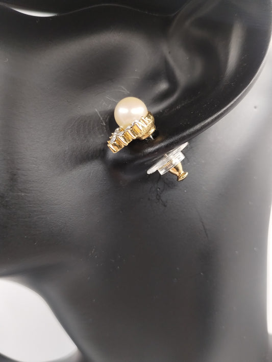 Vintage Signed Monet Gold Tone Faux Pearl Rhinestone Stud Earrings Pierced