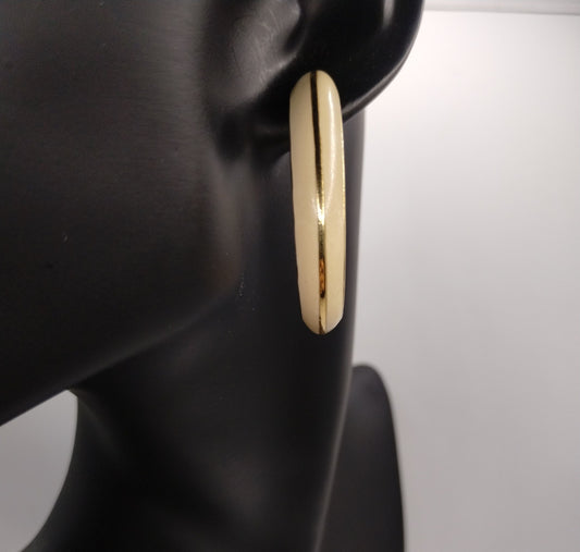 Vintage Signed Trifari Large Gold Tone Ivory Cream Enamel Hoop Pierced Earrings