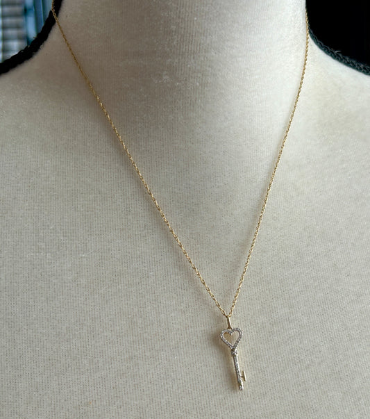 10k Yellow Gold Pave Diamond Skeleton Key Heart Pendant Necklace Chain