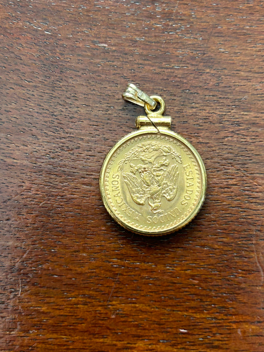 1945 Gold Dos Y Medio Pesos Coin 14k Yellow Gold Bezel Necklace Pendant Charm