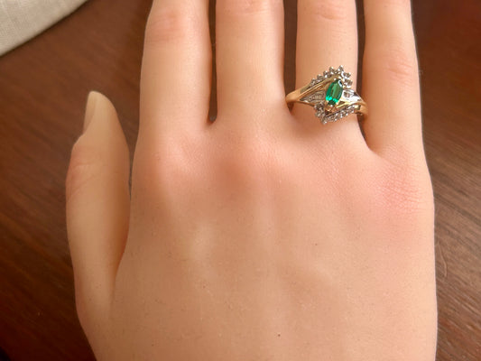10k Yellow Gold Simulated Marquise Emerald Diamond Baguette Ring Sz 9.25