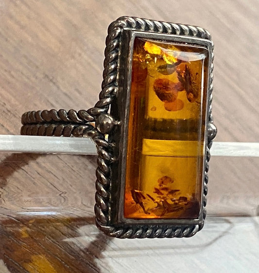 Sterling Silver Baltic Amber Rectangle Rope Edge Ring Sz 9