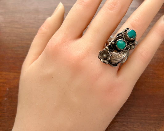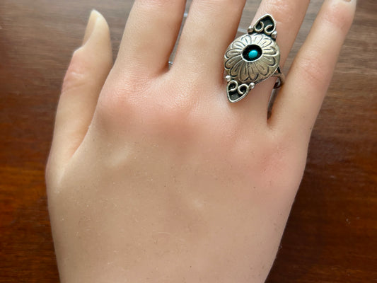 Native American Sterling Silver 925 Turquoise Ring Sz 7 Signed RHR Flower Motif