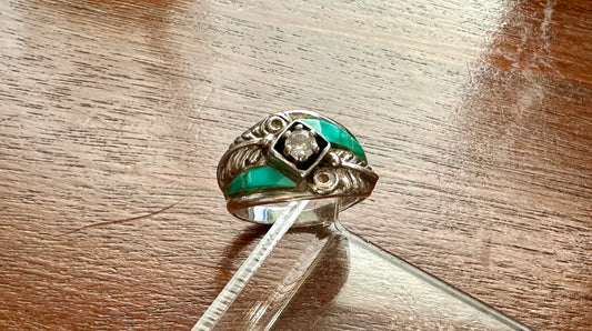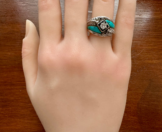 Signed CW Navajo Sterling Silver 925 Turquouse CZ Black Relief Ring Sz 7.25
