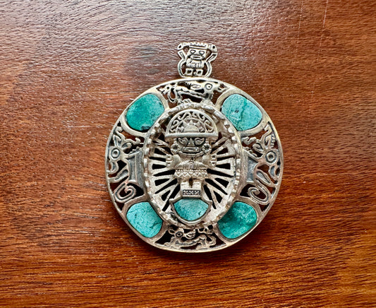 Vintage Sterling Silver 925 Turquoise Mayan Aztec Brooch Pin Necklace Pendant