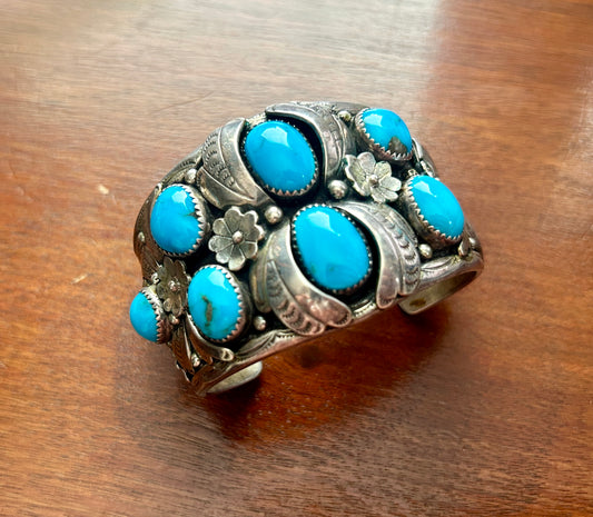 Vintage Old Pawn Lester Jackson Signed Sterling Silver Turquoise Cuff Bracelet