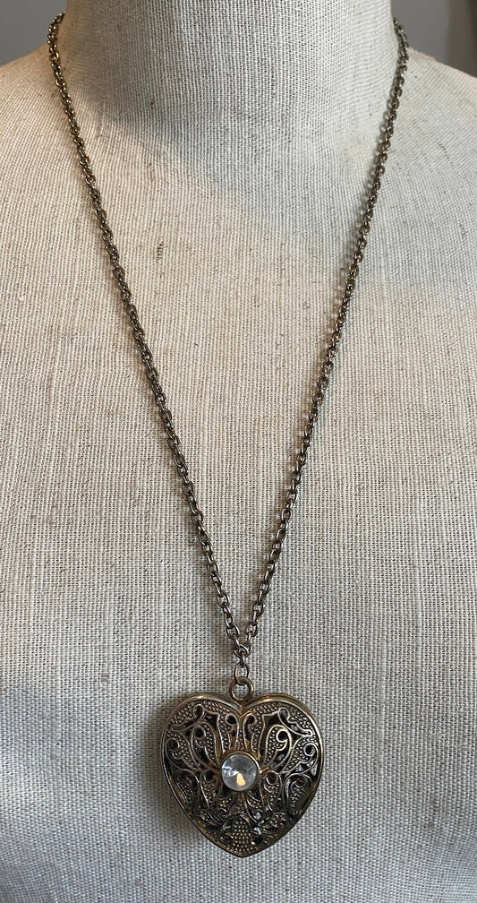 Victorian Style Chain Link Filigree Heart Rhinestone Pendant Necklace